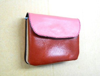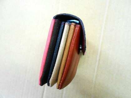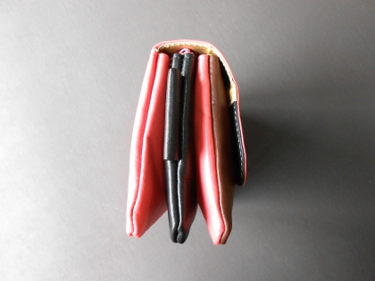 3連の独立した収納部、お札、小銭、カード等 | 表面は茶系、蓋はピンク色 | |