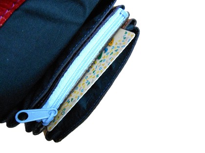 本体開閉はマグネ、中はファスナーポケット、ポケット各2ヶ所 | 下側の小さいポケットは、カード、携帯位が入ります |
