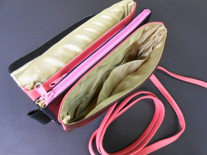 2か所の別収納口 内装入口のみ革使用 | 袋と袋の間にポケットがあります | |