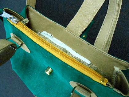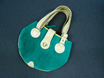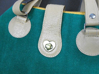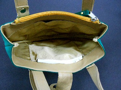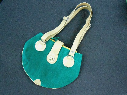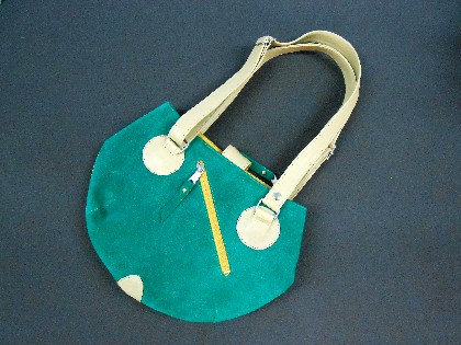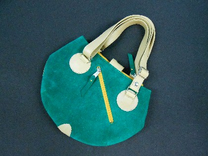 | グリーン、ベージュコンビのまる〜いバッグ | 後ろ側も同じ手の配置、 ファスナーポケットも | |
